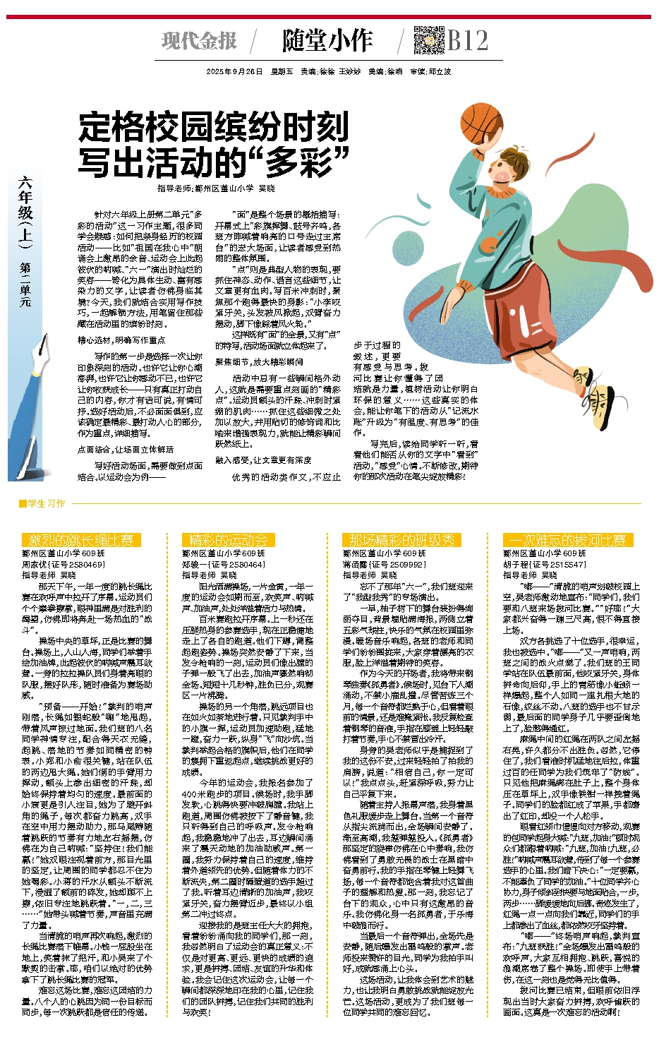 针对六年级上册第二单元“多彩的活动”这一习作主题,很多同学会疑惑:如何把亲身经历的校园活动——比如“祖国在我心中”朗诵会上激昂的余音、运动会上此起彼伏的呐喊、“六一”演出时灿烂的笑容——转化为具体生动、富有感染力的文字,让读者仿佛身临其境?今天,我们就结合实用写作技巧,一起解锁方法,用笔留住那些藏在活动里的缤纷时刻。