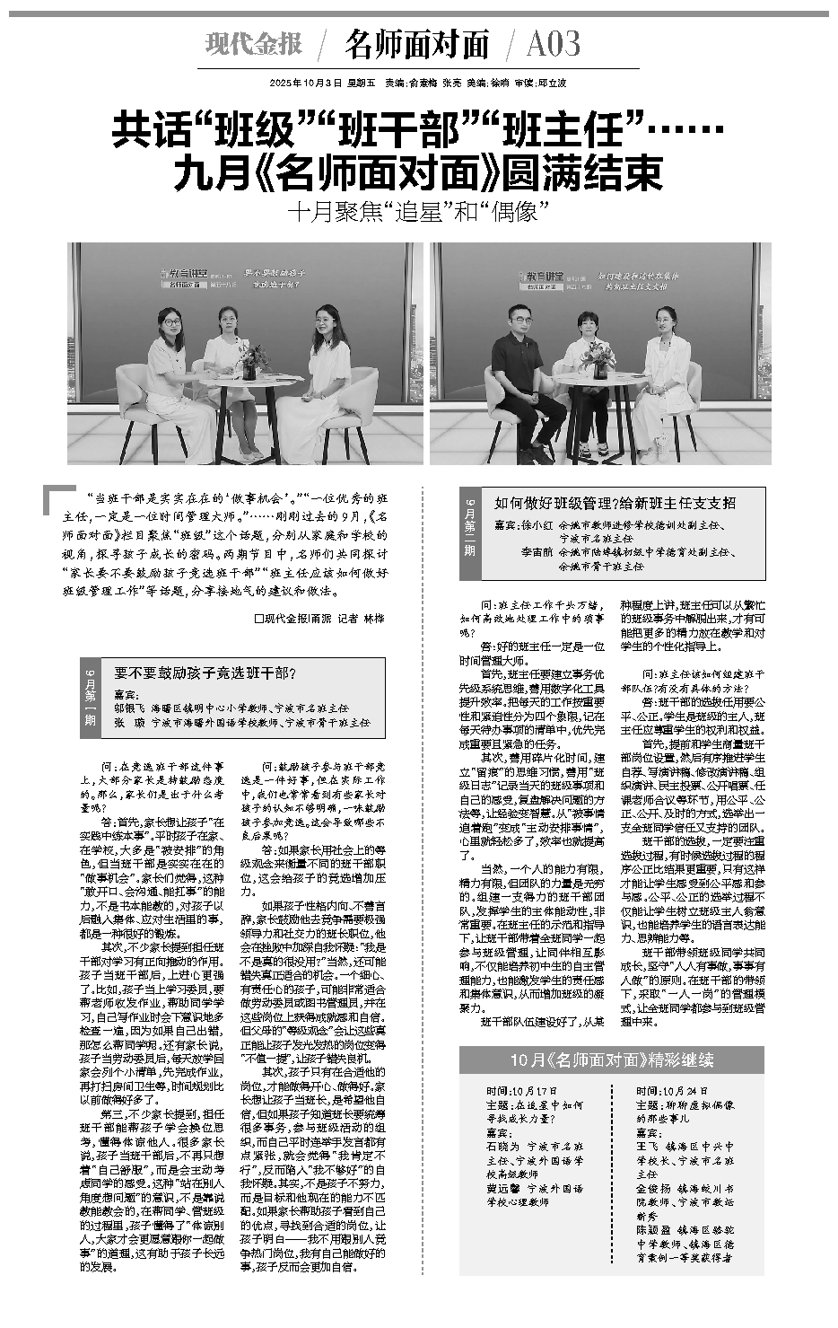 “当班干部是实实在在的‘做事机会’。”“一位优秀的班主任,一定是一位时间管理大师。”……刚刚过去的9月,《名师面对面》栏目聚焦“班级”这个话题,分别从家庭和学校的视角,探寻孩子成长的密码。两期节目中,名师们共同探讨“家长要不要鼓励孩子竞选班干部”“班主任应该如何做好班级管理工作”等话题,分享接地气的建议和做法。