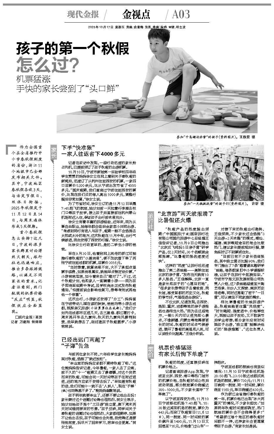 作为浙江全省推行春秋假的第一年,机票价格已出现“冰火两重天”的情况,不少家长担忧:“如果明年秋假时间提前确定,热门航线的票价会不会涨得更多?”“希望浙江每个地区的春秋假时间都不一样,这样家长会更愿意带孩子出游。”有家长如是说。