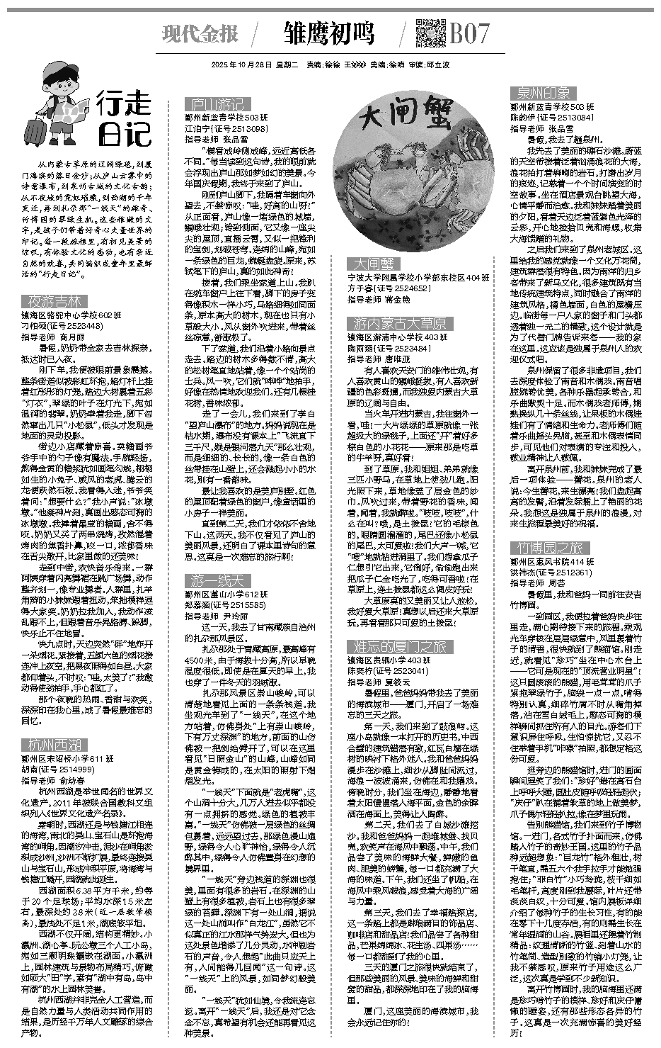 从内蒙古草原的辽阔绿毯,到厦门海滨的落日金沙;从庐山云雾中的诗意瀑布,到泉州古城的文化古韵;从不夜城的霓虹璀璨,到西湖的千年变迁,再到扎尕那“一线天”的雄奇、竹博园的翠绿生机。这些稚嫩的文字,是孩子们带着好奇心丈量世界的印记。每一段旅程里,有初见美景的惊叹,有体验文化的感动,也有亲近自然的欢喜,共同编织成童年里最鲜活的“行走日记”。