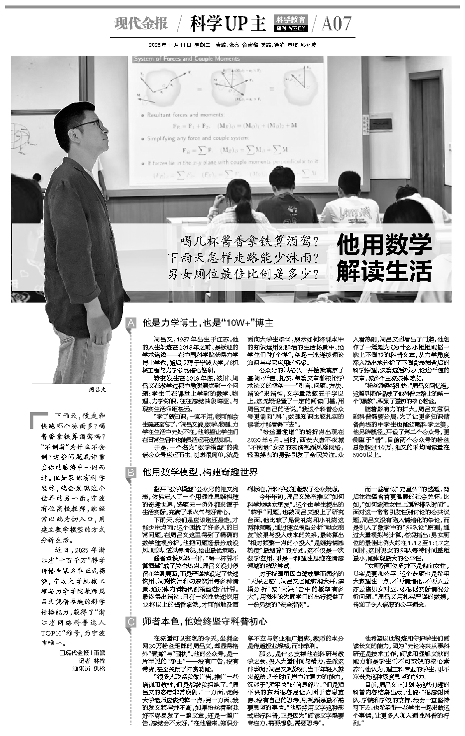 下雨天,慢走和快跑哪个淋雨多?喝酱香拿铁算酒驾吗?“不倒翁”为什么不会倒?这些问题或许曾在你的脑海中一闪而过。但如果你有科学思维,就会发现这个世界的另一面。宁波有位高校教师,就经常以此为切入口,用建立数学模型的方式分析生活。