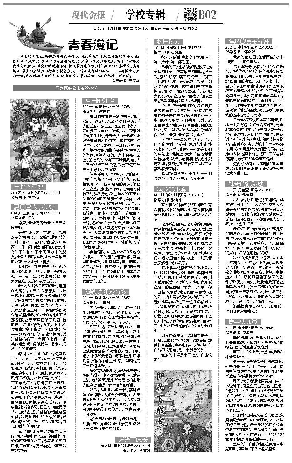 校园的晨光里,有银杏叶铺就的金色小径,有屋顶农场里垂落的翠绿豇豆;自然的怀抱中,有钱塘江潮的温柔呢喃,有家乡小溪的清凉嬉戏,有夏日江畔的晚风与欢歌。从课堂外的观潮感悟、快递员角色扮演,到假期里的划船冒险、溪边捕鱼,学生的生活如同打翻了调色盘,每一笔都是鲜活的体验——既有探索自然的好奇,也有挑战自我的勇气;既有日常小事的温馨,也有成长路上的思考。