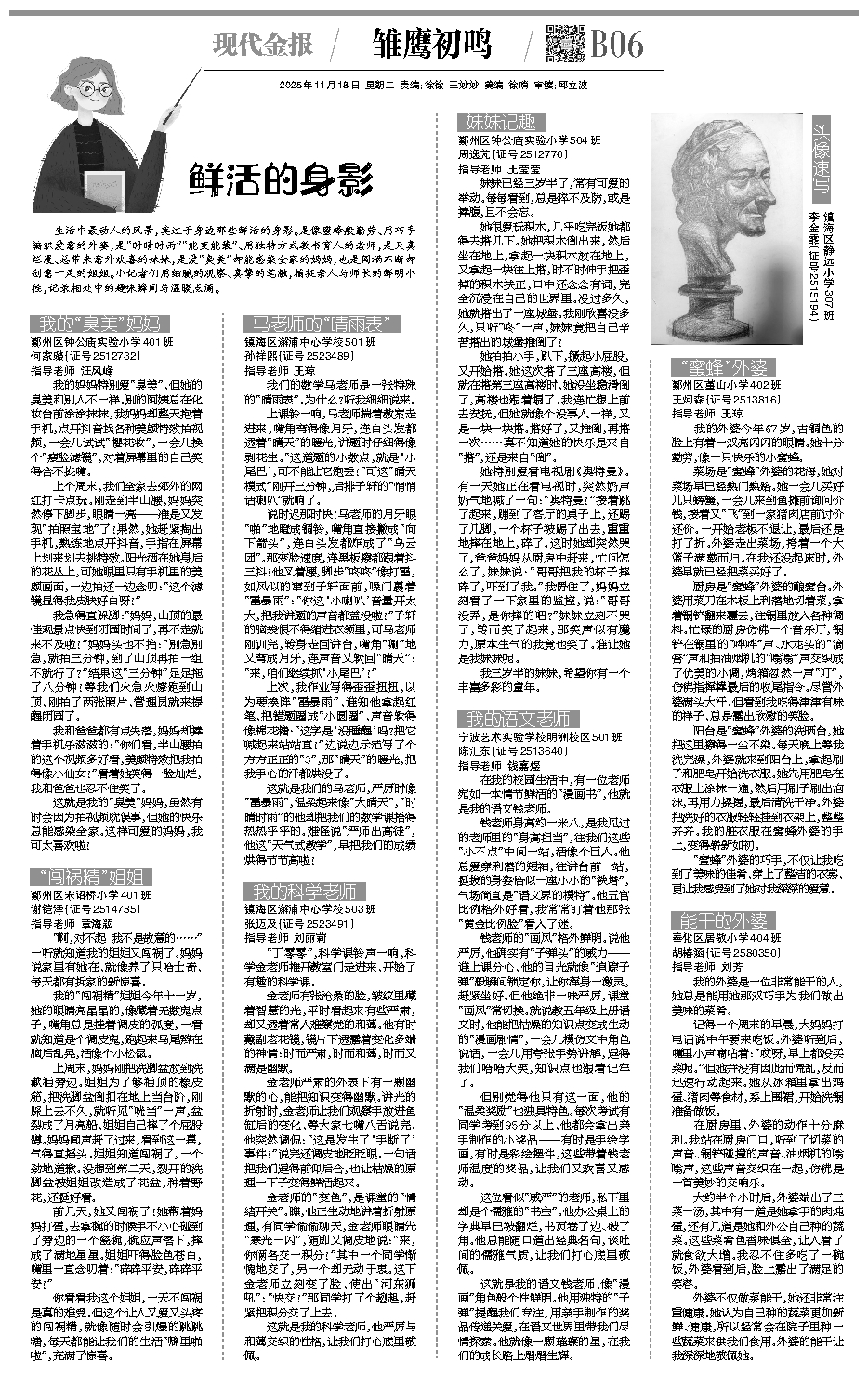 生活中最动人的风景,莫过于身边那些鲜活的身影。是像蜜蜂般勤劳、用巧手编织爱意的外婆,是“时晴时雨”“能变能装”、用独特方式教书育人的老师,是天真烂漫、总带来意外欢喜的妹妹,是爱“臭美”却能感染全家的妈妈,也是闯祸不断却创意十足的姐姐。小记者们用细腻的观察、真挚的笔触,捕捉亲人与师长的鲜明个性,记录相处中的趣味瞬间与温暖点滴。