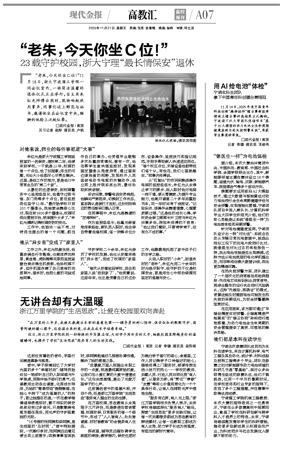 从刚入职时的“小朱”,到退休时的“老朱”,朱红光用二十余年的时光恪尽职守。他守护的不仅是校园安全,更是师生心中那份细微而坚定的温暖与安心。