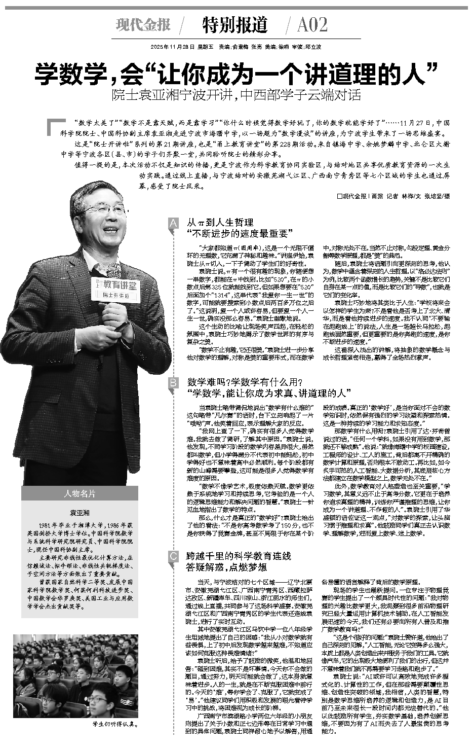 那数学有什么用呢?袁院士引用了达·芬奇曾说过的话,“任何一个学科,如果没有用到数学,那就还不够成熟”。他说:“就像海曙中学的校园建设,工程师的设计、工人的施工,背后都离不开精确的数学计算和原理,否则根本不敢动工。再比如,如今炙手可热的人工智能、大数据分析,其底层核心方法都建立在数学模型之上,数学无处不在。”