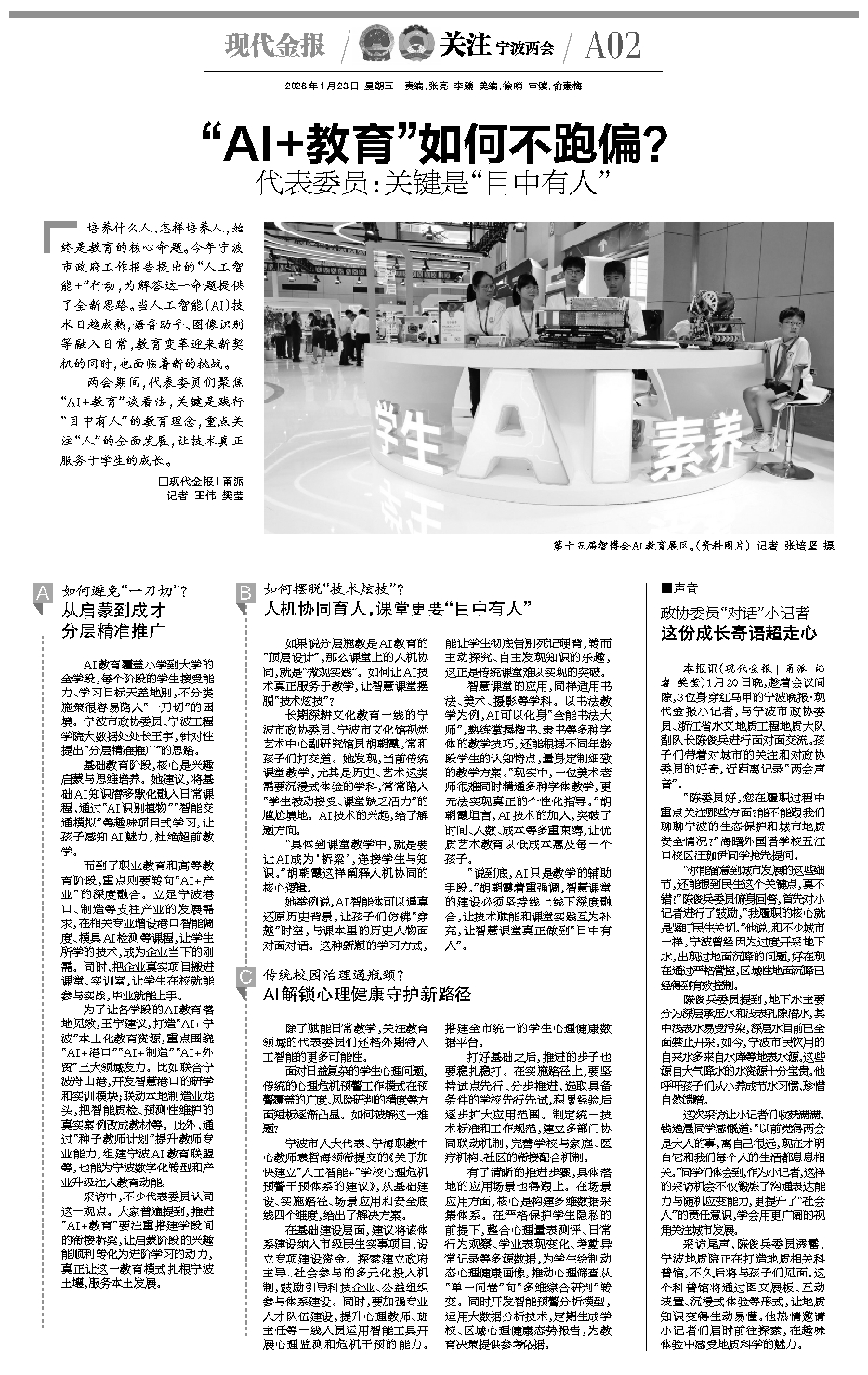 采访中,不少代表委员认同这一观点。大家普遍提到,推进“AI+教育”要注重搭建学段间的衔接桥梁,让启蒙阶段的兴趣能顺利转化为进阶学习的动力,真正让这一教育模式扎根宁波土壤,服务本土发展。