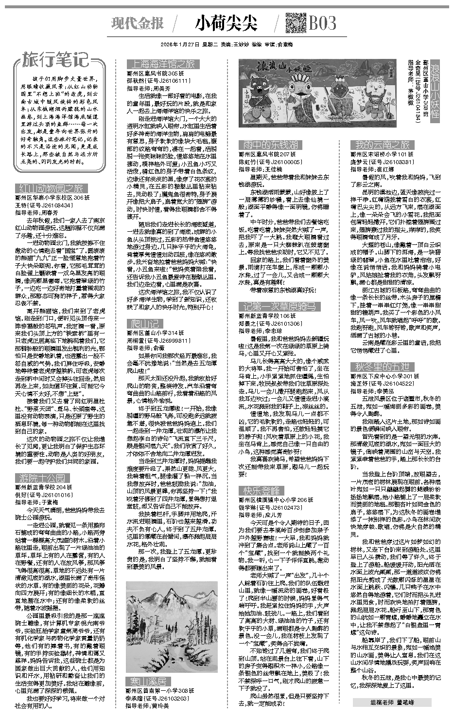 孩子们用脚步丈量世界,用眼睛收藏风景:从红山动物园里“不想上班”的老虎,到云南古城中随风旋转的彩色风车;从东钱湖烟雨朦胧的山水画卷,到上海海洋馆海底隧道里游过头顶的鱼群……每一次出发,都是童年向世界张开的好奇触角。这些旅行笔记,记录的不只是沿途的见闻,更是成长路上,那些被自然与远方所点亮的、闪闪发光的时刻。