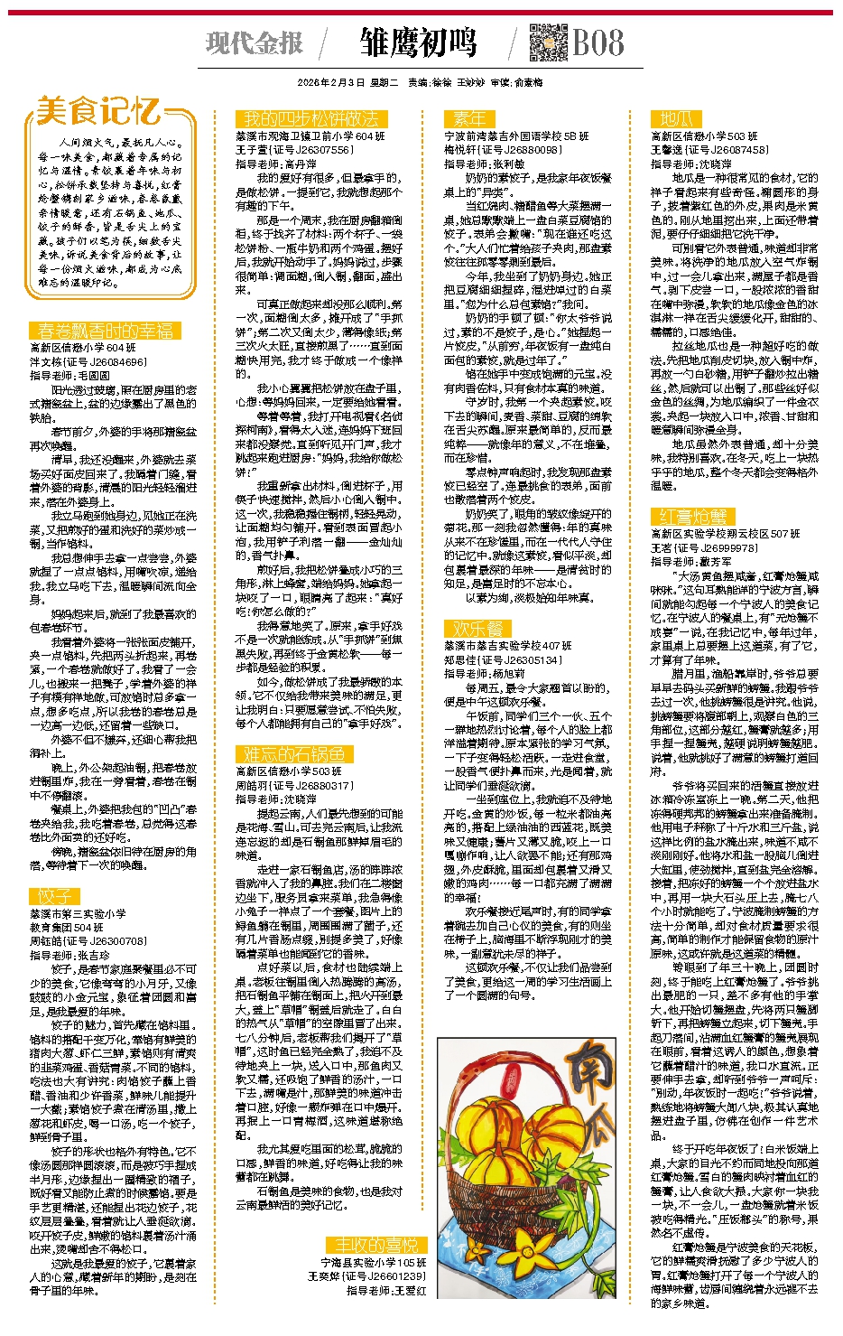 人间烟火气,最抚凡人心。每一味美食,都藏着专属的记忆与温情。素饺裹着年味与初心,松饼承载坚持与喜悦,红膏炝蟹镌刻家乡滋味,春卷氤氲亲情暖意,还有石锅鱼、地瓜、饺子的鲜香,皆是舌尖上的宝藏。孩子们以笔为筷,细数舌尖美味,诉说美食背后的故事,让每一份烟火滋味,都成为心底难忘的温暖印记。