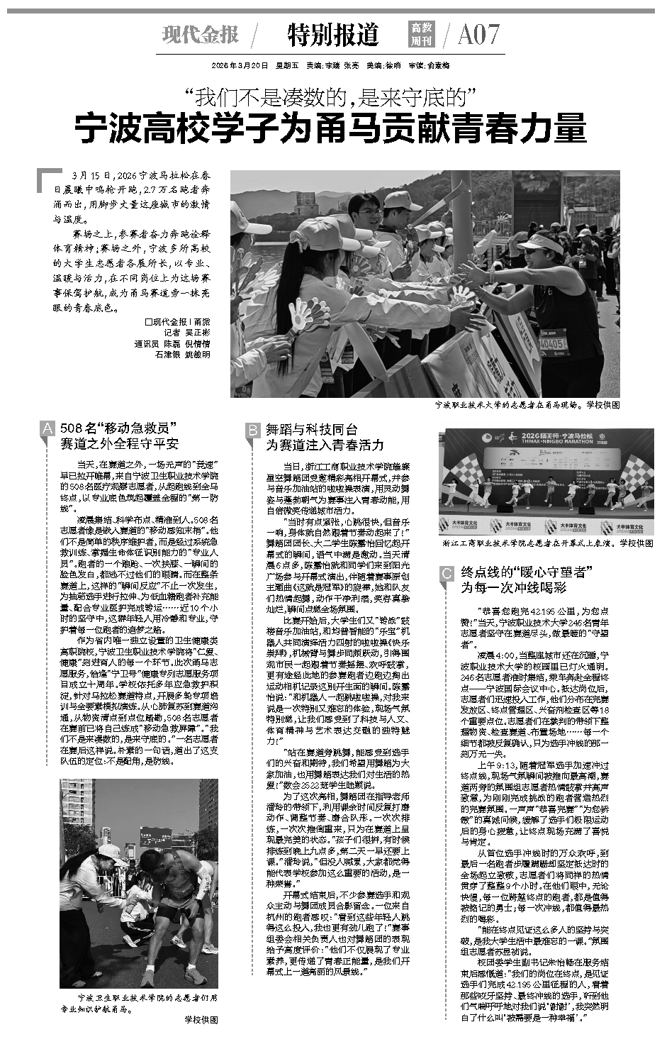 赛场之上,参赛者奋力奔跑诠释体育精神;赛场之外,宁波多所高校的大学生志愿者各展所长,以专业、温暖与活力,在不同岗位上为这场赛事保驾护航,成为甬马赛道旁一抹亮眼的青春底色。
