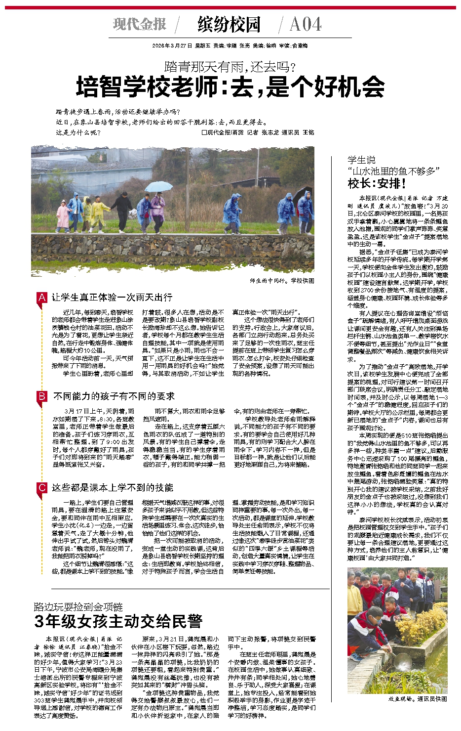 这个想法很快得到了老师们的支持。行政会上,大家商议后,各部门立刻行动起来。总务处买来了足够的一次性雨衣,班主任提前在班上带领学生复习怎么穿雨衣、怎么打伞,校安处仔细检查了安全预案,设想了雨天可能出现的各种情况。