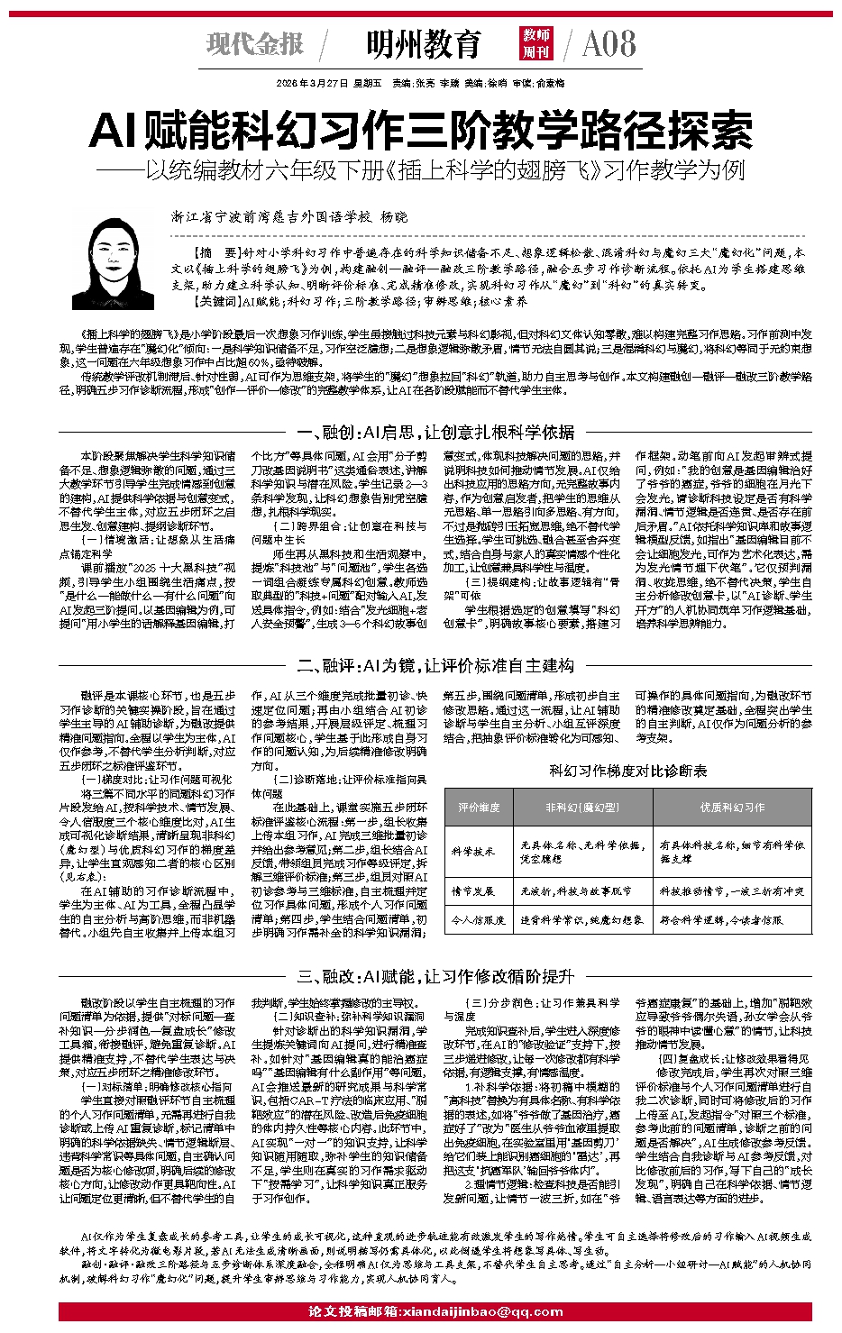 传统教学评改机制滞后、针对性弱,AI可作为思维支架,将学生的“魔幻”想象拉回“科幻”轨道,助力自主思考与创作。本文构建融创—融评—融改三阶教学路径,明确五步习作诊断流程,形成“创作—评价—修改”的完整教学体系,让AI在各阶段赋能而不替代学生主体。