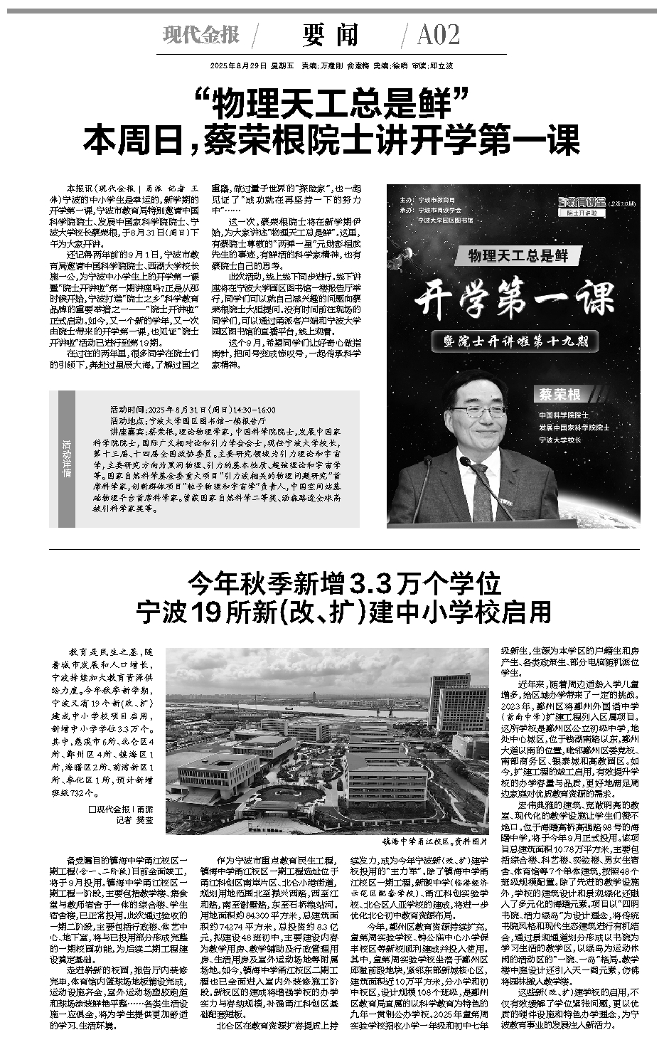 今年秋季新增3.3万个学位 宁波19所新(改、扩)建中小学校启用
