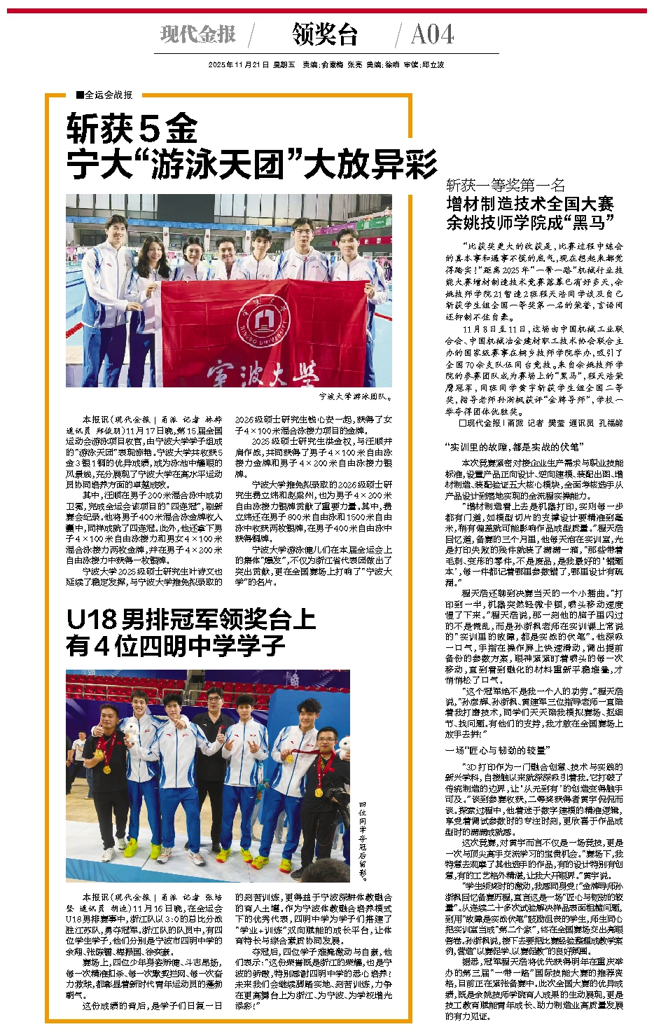U18男排冠军领奖台上 有4位四明中学学子